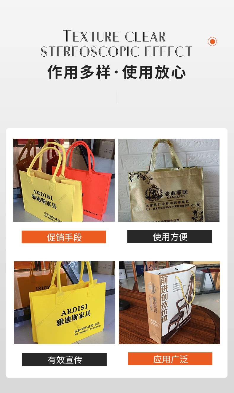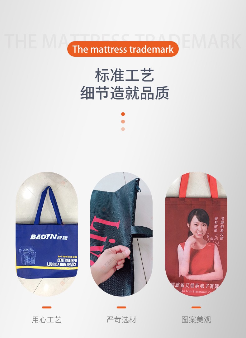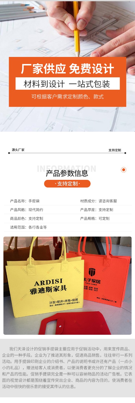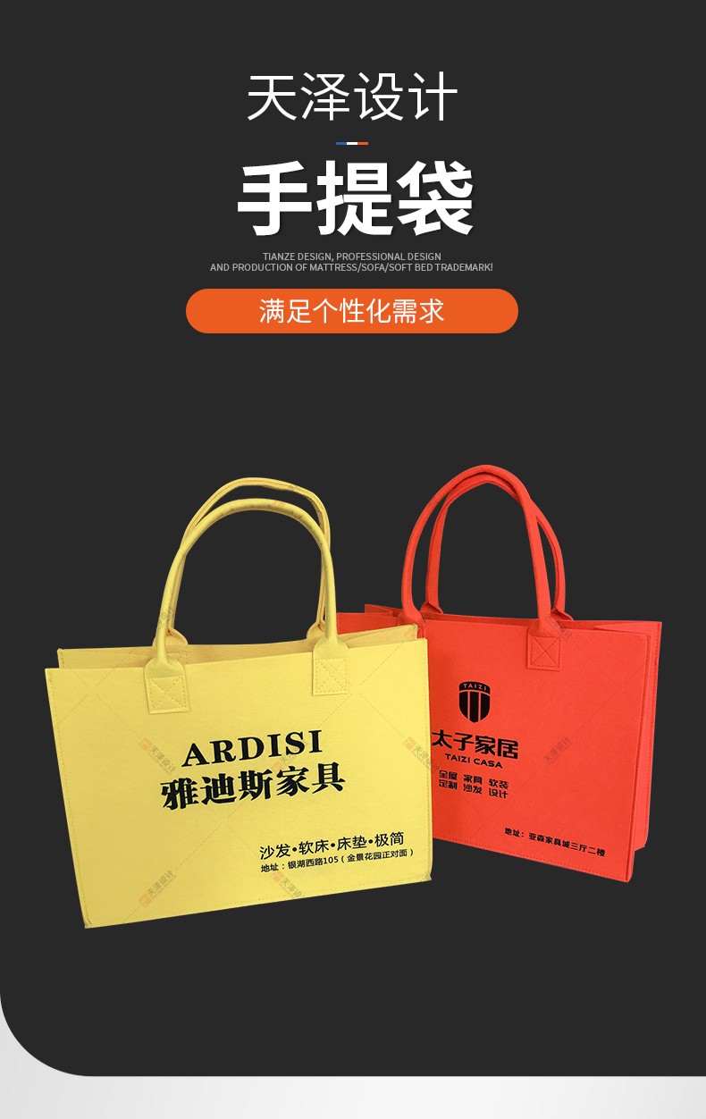 我们天泽设计的促销手提袋主要应用于促销活动中,用来宣传商品、企业的一种手段。企业为了推进其形象,促进商品销售,往往举行一系列活动。用手提袋印刷企业的介绍书、产品的说明书或许还有产品(一点小小的礼品),赠送给客人或消费者,以便消费者更充分的了解企业的情况和产品的性能。促销手提袋完全是一种可以容纳物品的活动广告板。它表面的视觉设计都是围绕着宣传突出企业、商品的内容为目的,使消费者在活动中很快的很乐意的接受其传认的信息。
